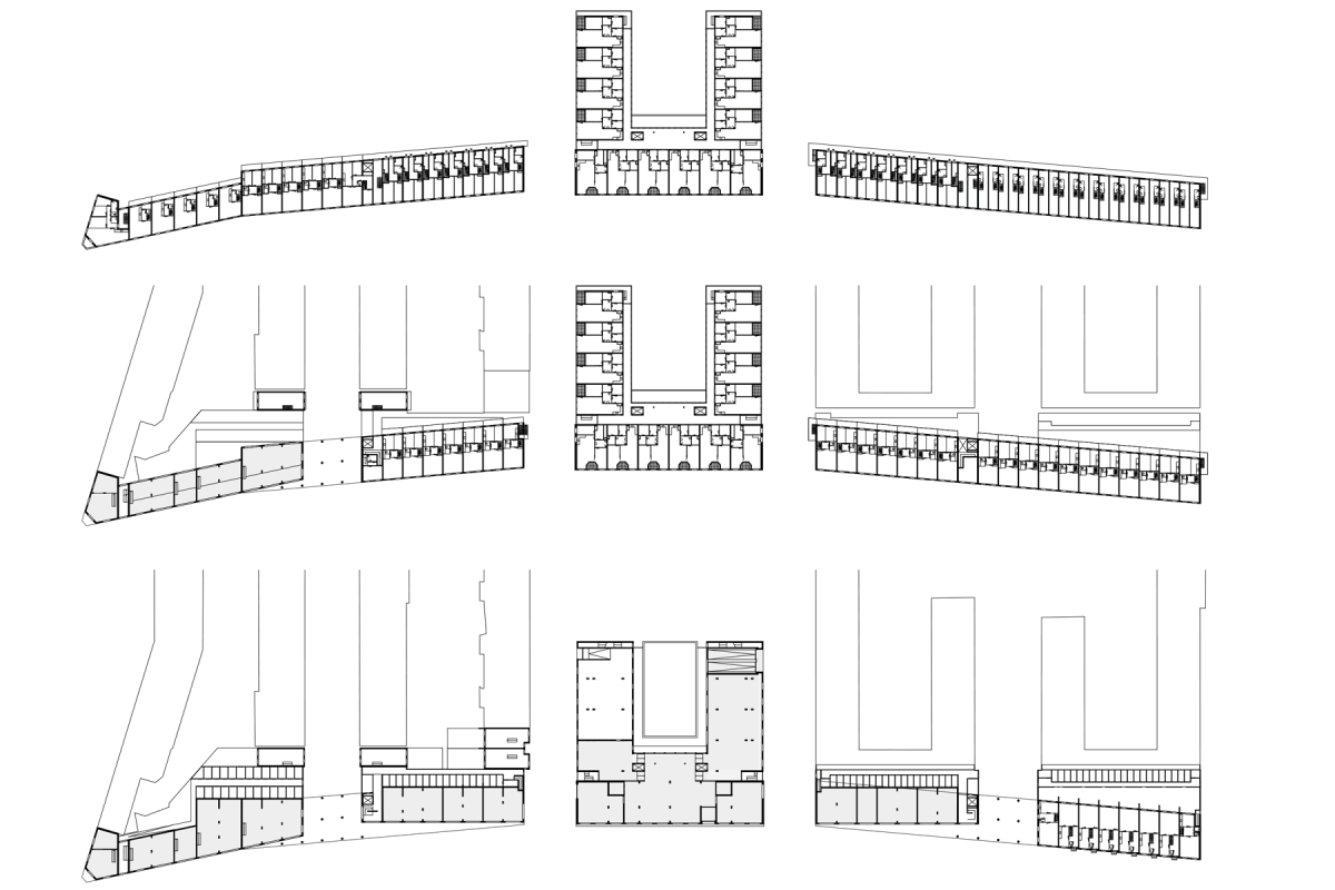 De draagstructuur van de zijgebouwen volgt het orthogonale systeem, hierdoor kunnen de buurtstraten onder de zijgebouwen worden doorgevoerd, de buitenruimtes vloeien hier in elkaar over. De straatwand langs de Putselaan begeleidt op deze manier twee vormen van bewegen; vanuit de auto en tram de beweging door de stad, voor de voetganger geeft de terugliggende ruimte een gevoel van ‘door de wand heen’: de zijstraten, de ruimte van de buurt, een plein.